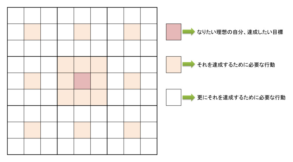 マンダラチャートとも呼ばれ、大谷翔平選手が使用したことがメディアで取り上げられ大変話題になりました。なりたい理想の自分を真ん中に書きます。そしてその真ん中になるにはどのような行動をとればよいか書いていきます。