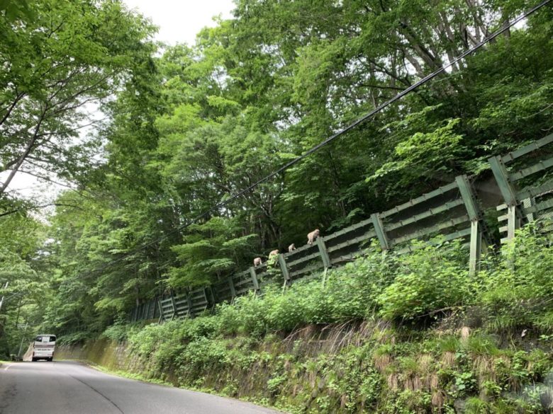 その土合駅に向かう途中、なんとお猿さんに遭遇しました。や、野生の猿だー!と、私たちは大興奮!フェンスをずっと歩いてました。
